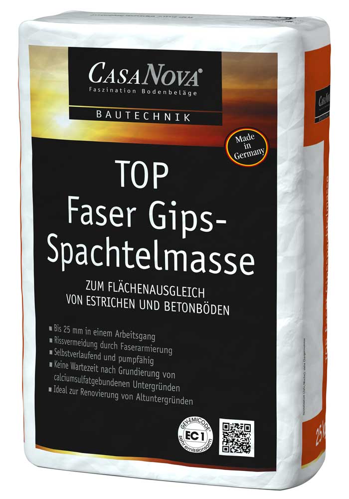 Selbstverlaufender und pumpfähiger faserarmierter Bodenausgleich für Schichtdicken von 3 – 25 mm in einem Arbeitsgang. Zur Erstellung normgerechter Untergründe für die Aufnahme von Bodenbelägen. TOP Faser Gipsspachtelmasse ist einsetzbar auf geeigneten Calciumsulfat- und Zementestrichen, Beton, Magnesia-, Steinholz- und Gussasphaltestrichen (bis 10 mm), Holzböden, Fertigteilestrichen, keramischen Fliesen, Naturwerkstein und Terrazzo sowie mineralischen Altuntergründen mit festhaftenden, wasserfesten Klebstoffresten. Im System mit TOP Mehrschicht Elastik Parkettkleber unter Parkett geeignet. TOP Faser Gipsspachtelmasse nicht als Estrich oder Nutzboden verwenden. Nur für den trockenen Innenbereich. Ab 3 mm Schichtdicke stuhlrollengeeignet bei Belastung mit Rollen gemäß DIN EN 12529. Auf beheizten Fußbodenkonstruktionen einsetzbar.