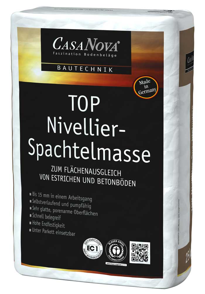 Selbstverlaufender und pumpfähiger Bodenausgleich für Schichtdicken von 0,5 – 15 mm in einem Arbeitsgang. Zur Erstellung normgerechter Untergründe für die Aufnahme von Bodenbelägen. TOP Nivellier-Spachtelmasse ist einsetzbar auf Estrichen, Beton, Fliesen und Platten, Naturstein und Terrazzo sowie mineralischen Altuntergründen mit festhaftenden, wasserfesten Klebstoffresten. Im System mit TOP Mehrschicht Elastik Parkettkleber unter Parkett geeignet. TOP Nivellier-Spachtelmasse nicht als Estrich oder Nutzboden verwenden. Nur für den trockenen Innenbereich. Ab 1 mm Schichtdicke stuhlrollengeeignet bei Belastung mit Rollen gemäß DIN EN 12529. Auf beheizten Fußbodenkonstruktionen einsetzbar.